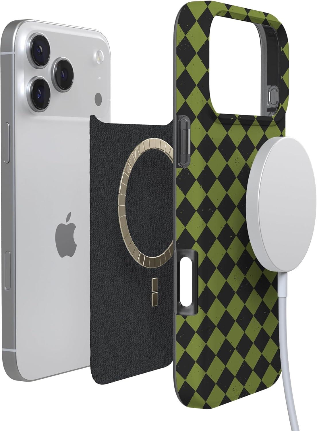 Casely iPhone 17 Pro Max Case | Fallen Gold | Antique Floral | Compatible with MagSafe | Classic Ultra Thin Design(Harlequin Wicked Diamond | Black and Green)
